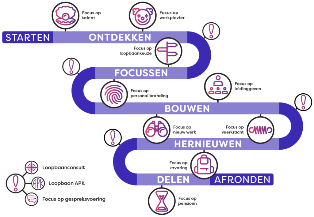 Focus gebruikt een model dat bestaat uit vijf levensfasen die relevant zijn tijdens je werkzame leven. Van de eerste baan tot aan het pensioen.